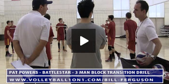 Battle Star – 3 Man Block Volleyball Transition Drill is a drill named and started by Olympian and former USC Coach Pat Powers. The drill basically is initiated with a high bounce ball by the coach in the back row which then sets up a set which likely has a 3 man block. The rally is then played out to work on transition offense and defense.