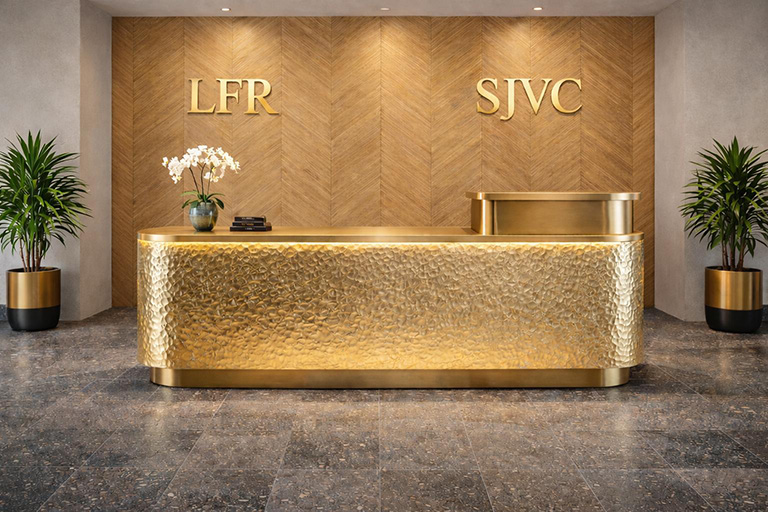 From the moment you arrive, the experience is unmistakable. Guests are welcomed by a 200- year-old ancient olive tree, a grand entry inspired by the calm, refined elegance of the Getty Museum, and a massive 6′ by 20′ Art Installation SJVC Sign that proudly marks the home of something extraordinary. Standing at the entrance is an 6’6″ – foot statue of Co-Founder Andor Gyulai, symbolizing the vision, legacy, and standard of excellence that defines SJVC.