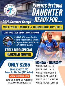 🏐 Volleyball Camp – Parents Get Your Daughter Ready for Middle School & High School Volleyball Try-outs. Bonus included: SJVC Season 26 / 27 Club Try-outs! Location: St. Augustine, Nocatee, Ponte Vedra, Saint Johns County