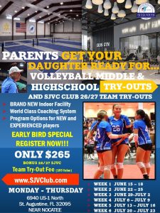 Welcome to SJVC, the first youth volleyball training facility in St. Johns County, Florida—located just 15 min. from Nocatee Town Center, 14 min. from St Augustine, 21 min. from SilverLeaf Amenities and 25 min. from St Johns Town Center. More than a youth volleyball facility, St. Johns Volleyball Club is a destination.