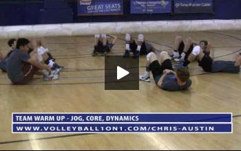 The next video features volleyball warm up exercises and drills called jog, core, dynamics. This is a great warm up for players of all levels and is quick and effective. This drill is a combination of what Chris learned at UCI (Playing), USC (Coaching), and USA National Team (Coaching and Playing).