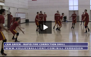 The next drill is USC Assistant Coach Cam Green’s Rapid Fire Correction Drill. The staff joke that this is how Cam gets so buffed but this is basically a very very fast passed correction drill that is used to get the team ready for the 6 on 6 team portion of practice. We like this drill at volleyball1on1 because of the energy it create and how it gets the players ready to compete.